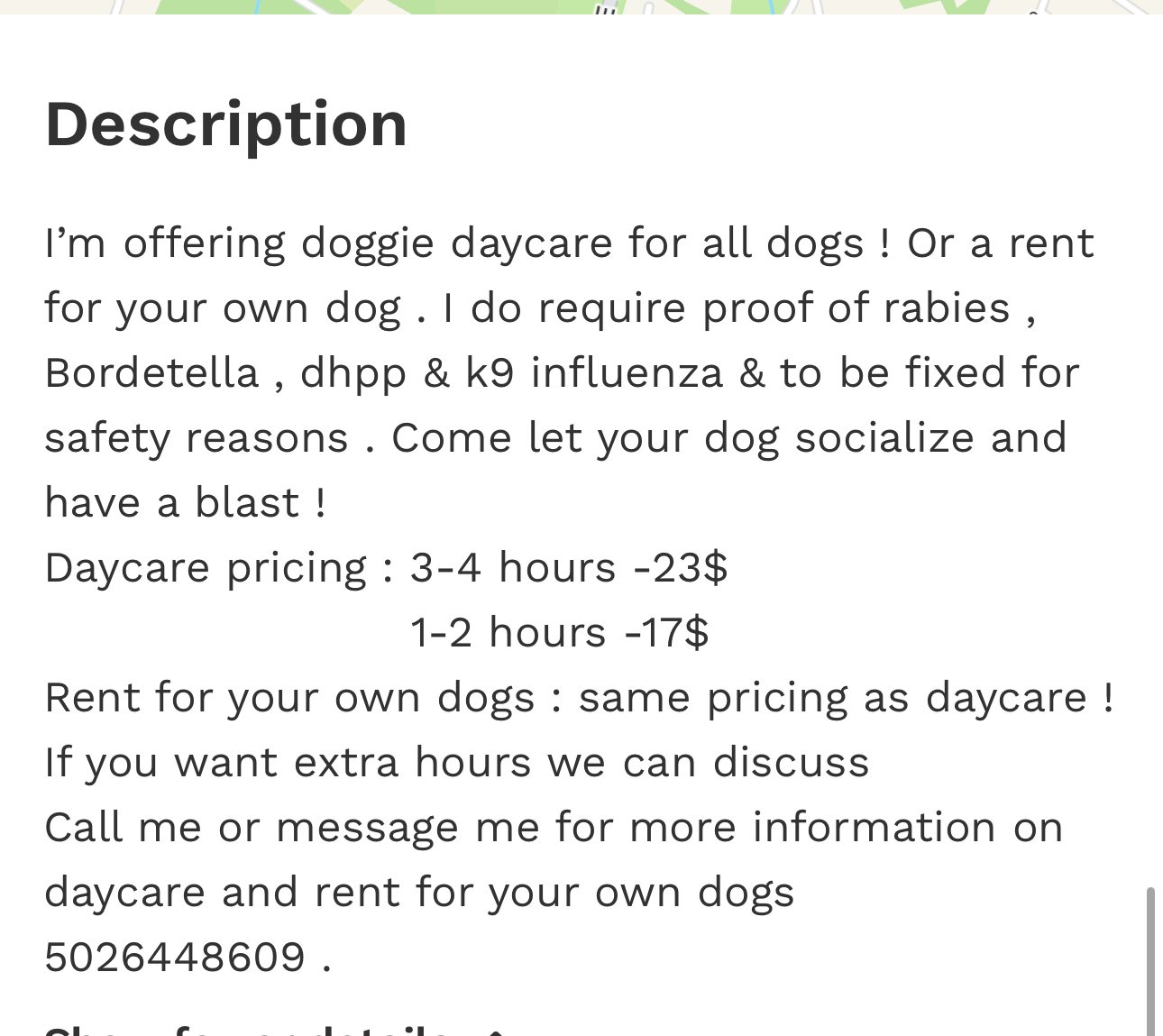 Daycare prices : 3-4 hours-23$ 1-2 hours -17$ rent for your dogs same pricing . More info5026448609